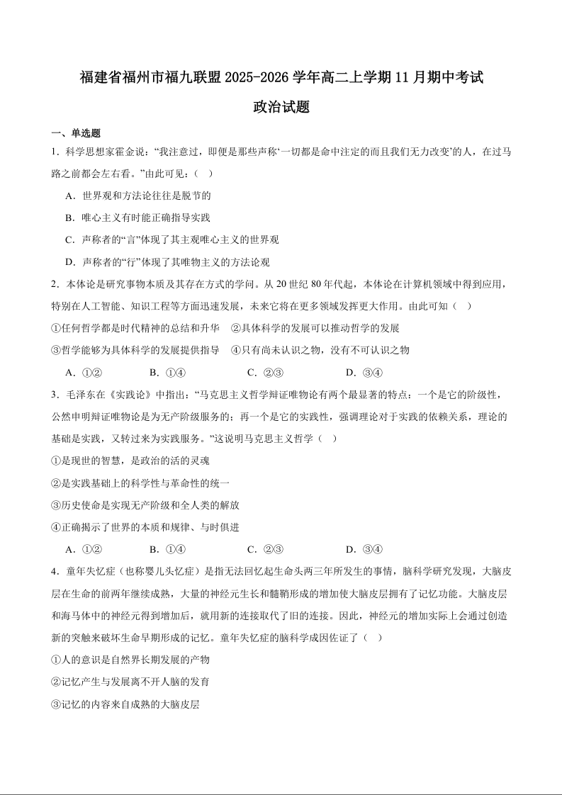 福建省福九联盟2025-2026学年高二上学期期中联考 政治试题(含答案).docx