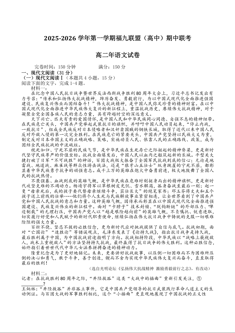 福建省福九联盟2025-2026学年高二上学期期中联考 语文试题(含答案).docx