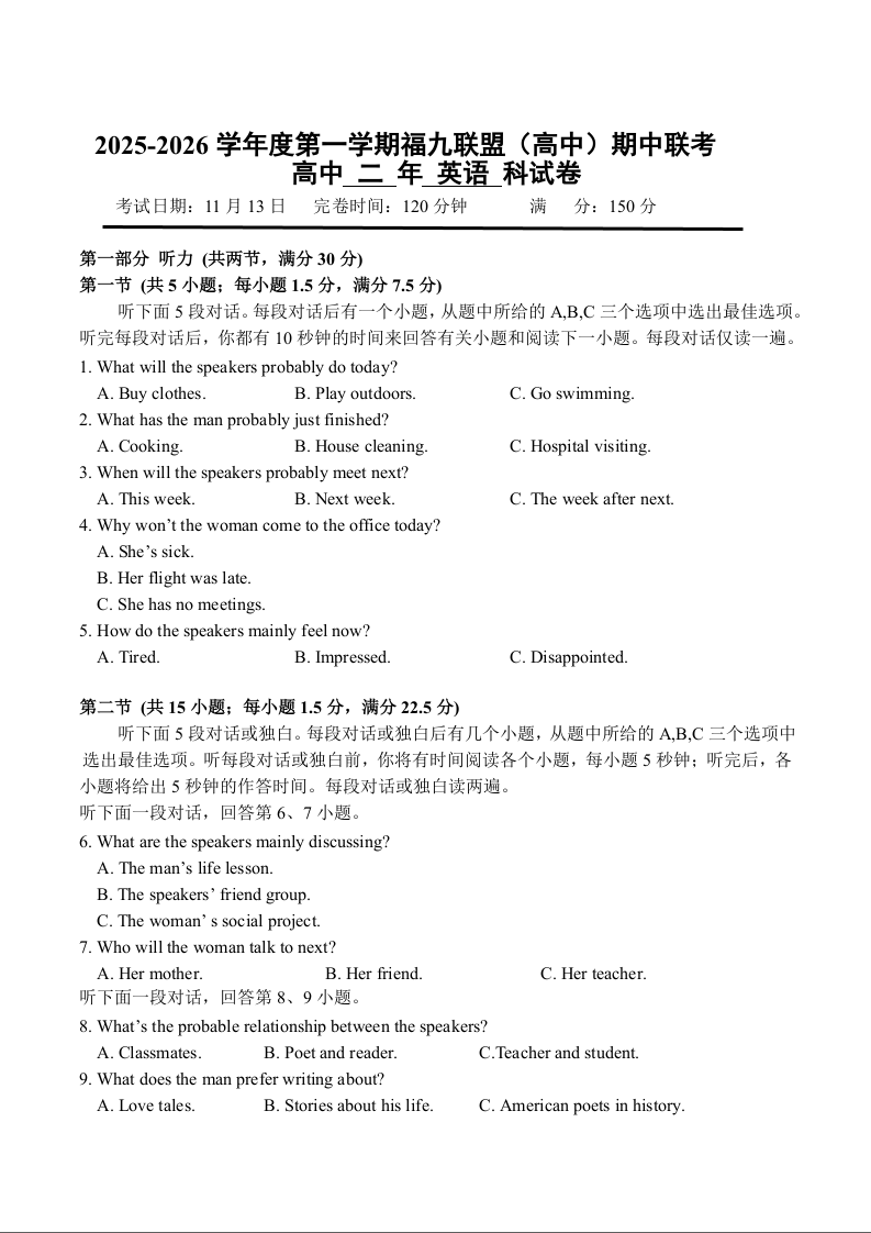 福建省福九联盟2025-2026学年高二上学期期中联考 英语试题(含答案).docx