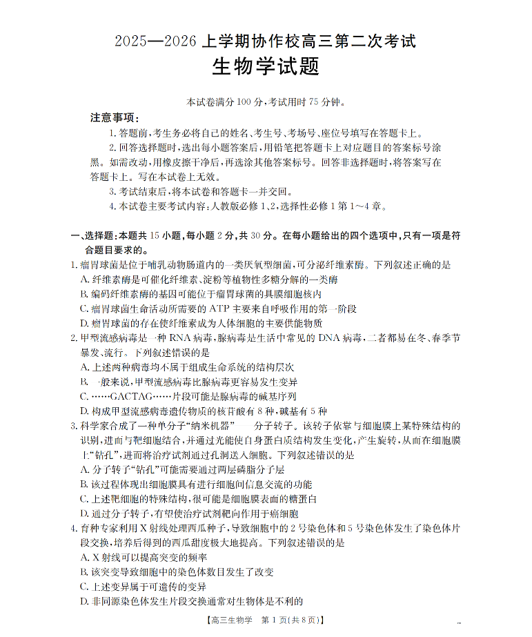 辽宁省葫芦岛市、县2026届高三上学期协作校第二次考试 生物.pdf