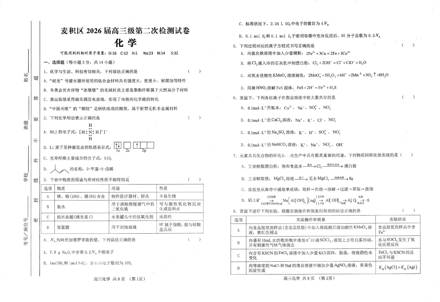 甘肃省天水市2026届高三上学期11月联考 化学.pdf