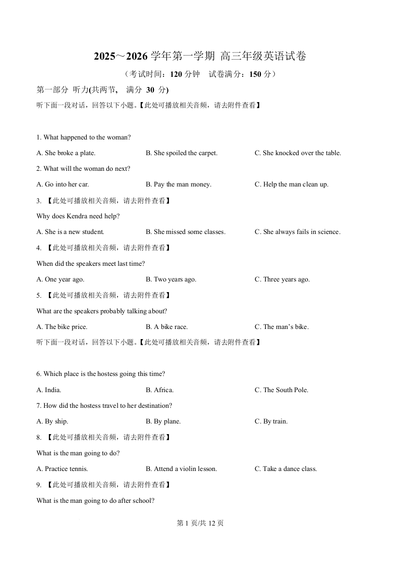 内蒙古自治区鄂尔多斯市第一中学2026届高三上学期12月月考 英语.docx