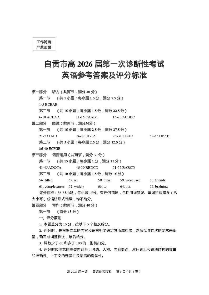 四川省自贡市普高2026届第一次诊断性考试 英语答案.pdf