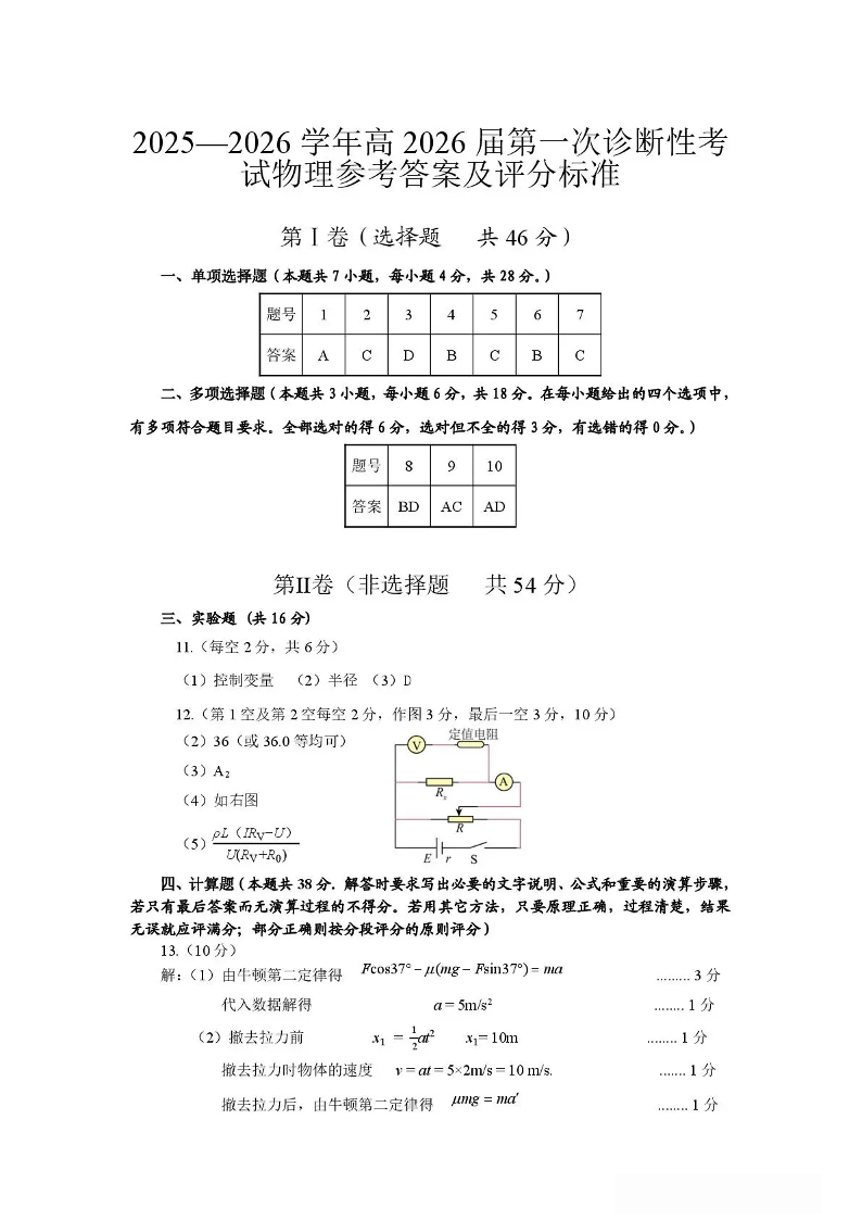 四川省自贡市普高2026届第一次诊断性考试 物理答案.pdf