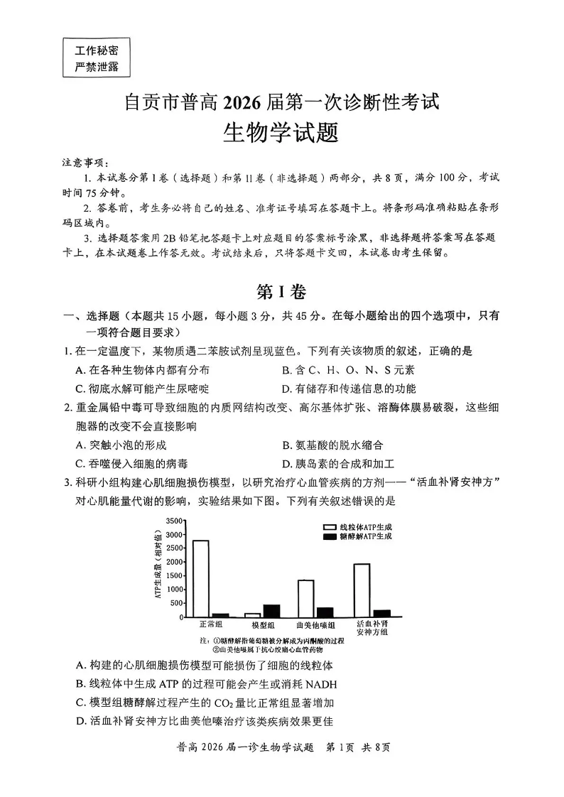 四川省自贡市普高2026届第一次诊断性考试 生物.pdf
