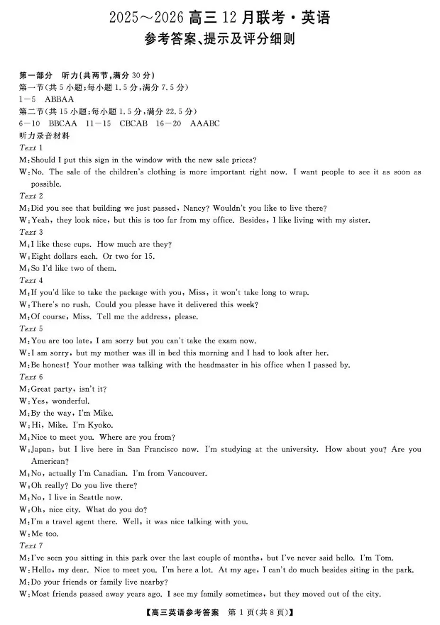 陕西省榆林市2025~2026学年度高三12月联考 英语答案.pdf
