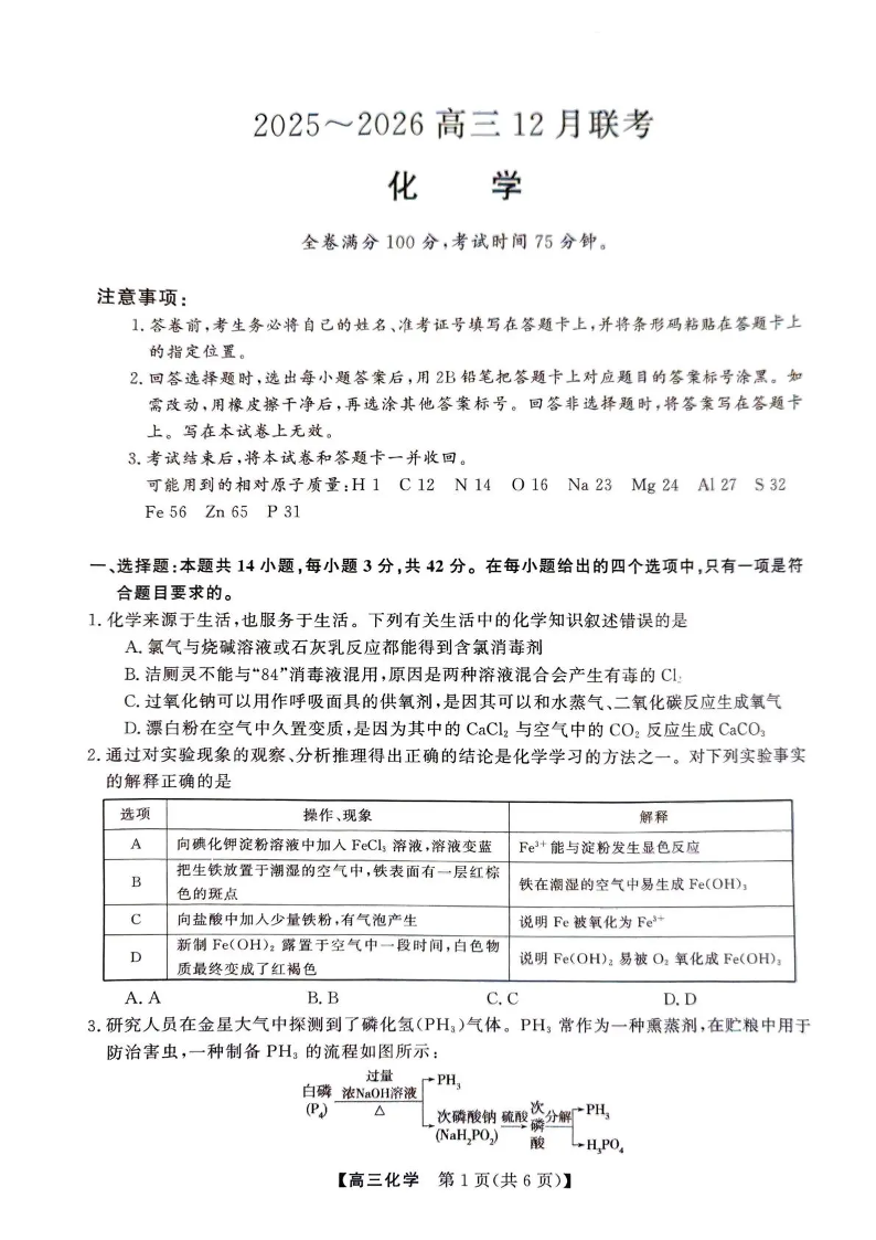 陕西省榆林市2025~2026学年度高三12月联考 化学.pdf