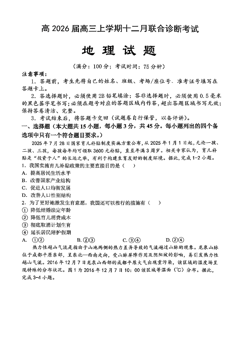 鲁能巴蜀中学、万州中学2026届高三上学期十二月联合诊断考试 地理.pdf