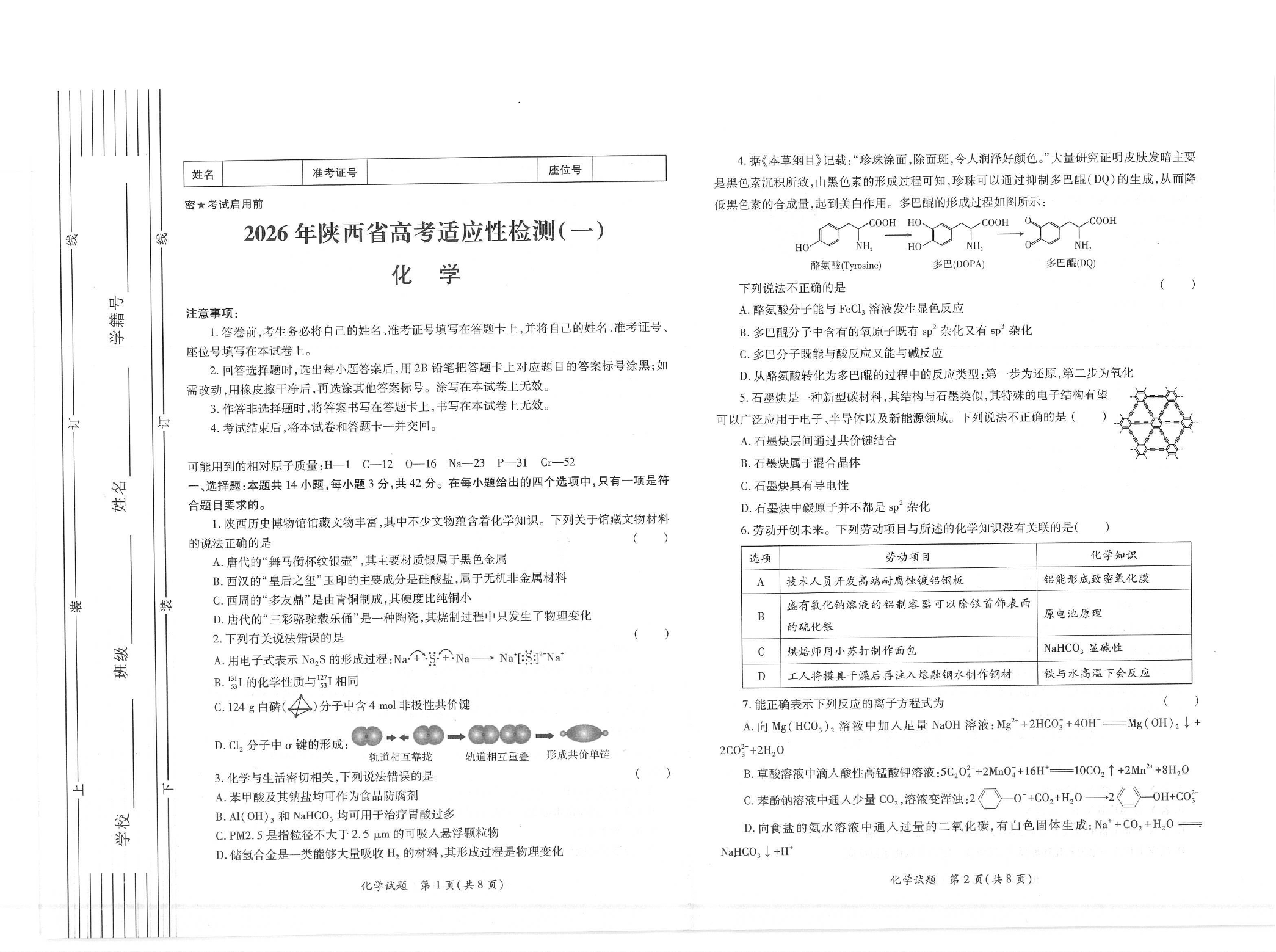 2026年陕西省高考适应性检测(一)化学试卷(含答案).pdf