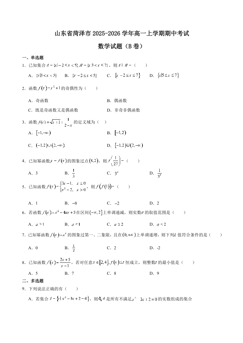 山东省菏泽市2025-2026学年高一上学期期中联考试题 数学(B)试题(含答案).docx