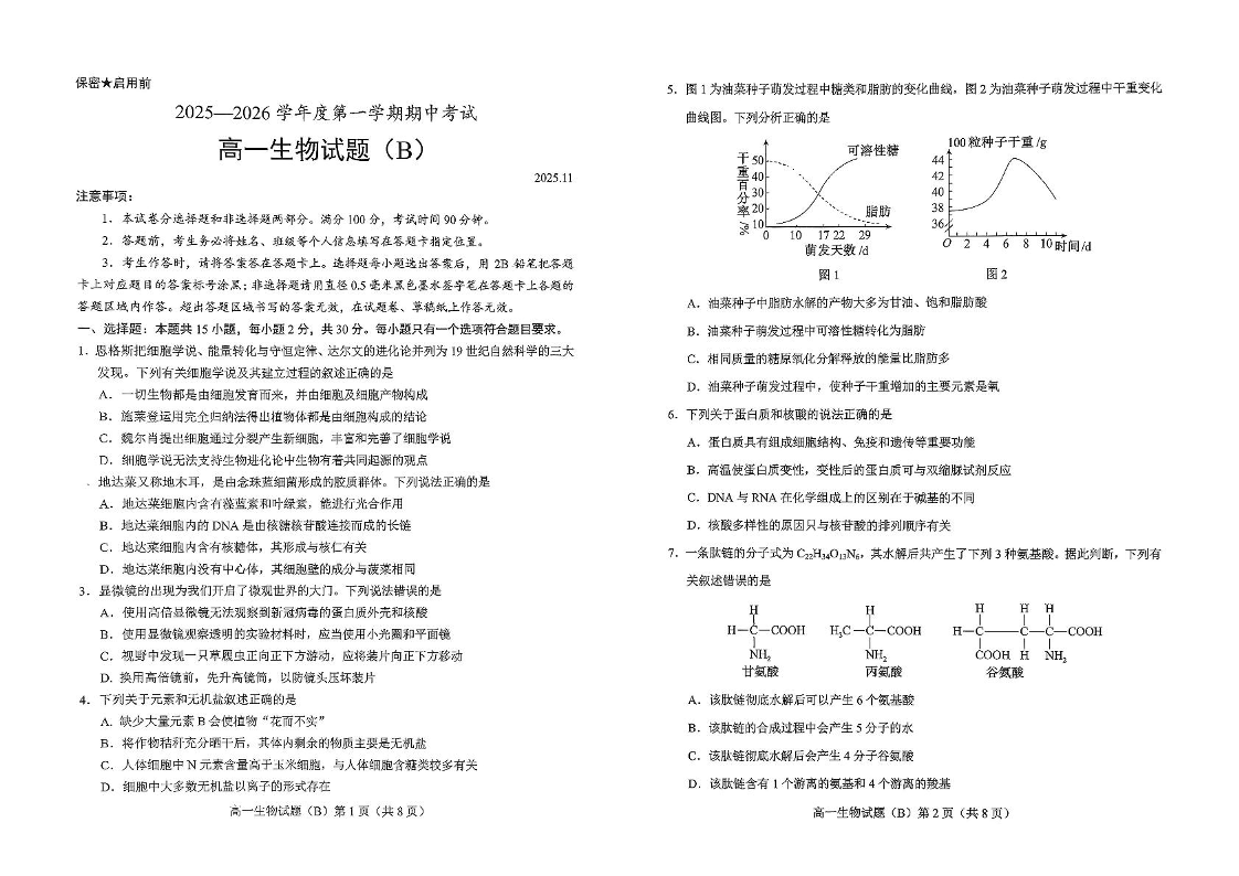 山东省菏泽市2025-2026学年高一上学期期中联考试题 生物(B)试题(含答案).pdf