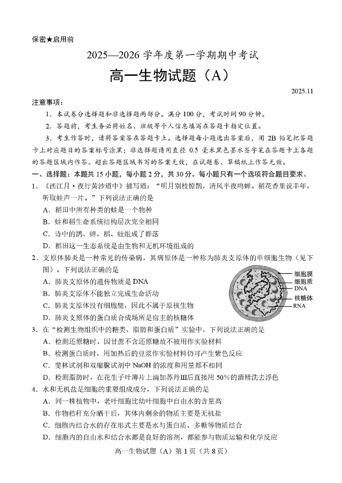 山东省菏泽市2025-2026学年高一上学期期中联考试题 生物(A)试题(含答案).pdf