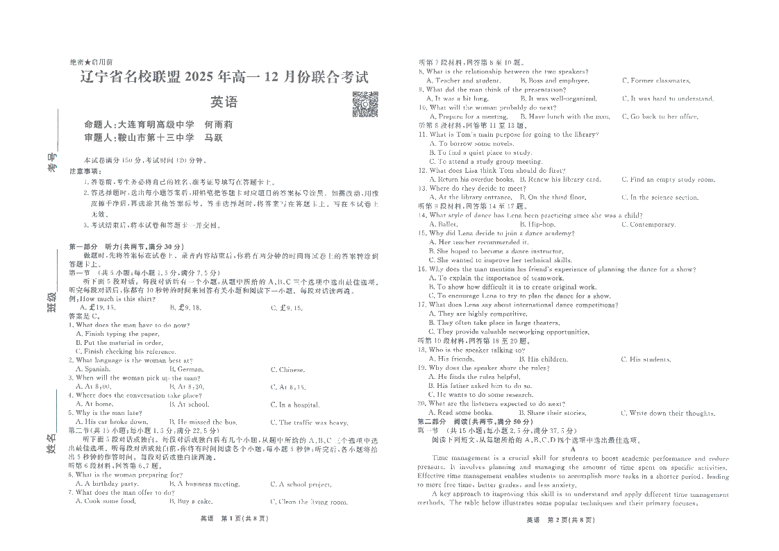 辽宁省名校联盟2025年高一12月份联合考试 英语.pdf