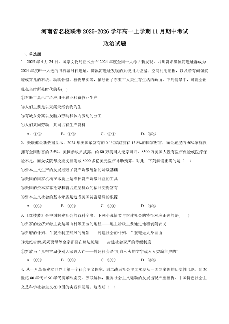 河南省名校联考2025-2026学年高一上学期11月期中考试 政治试题(含答案).docx