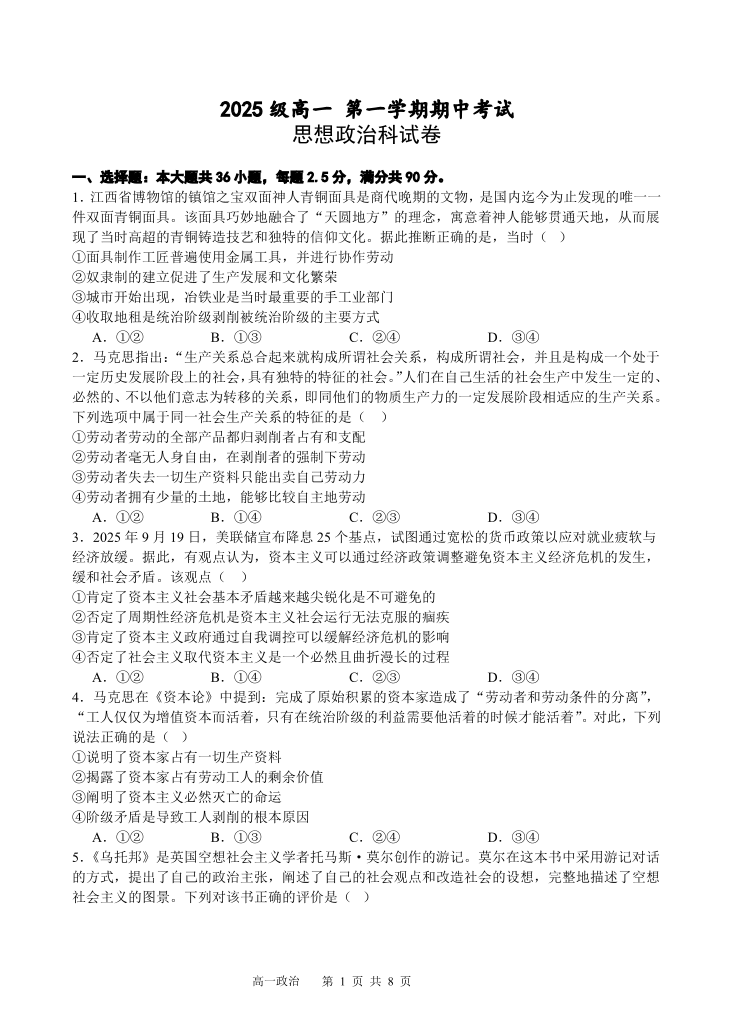 广东省汕头市金山中学2025-2026学年高一上学期期中考试 政治.pdf