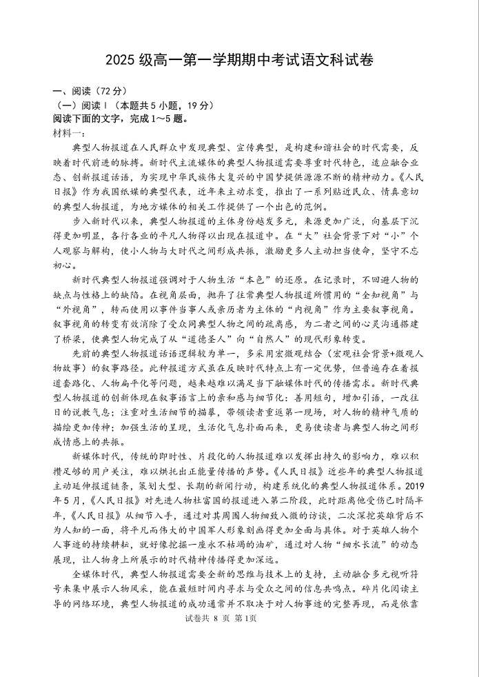 广东省汕头市金山中学2025-2026学年高一上学期期中考试 语文.docx