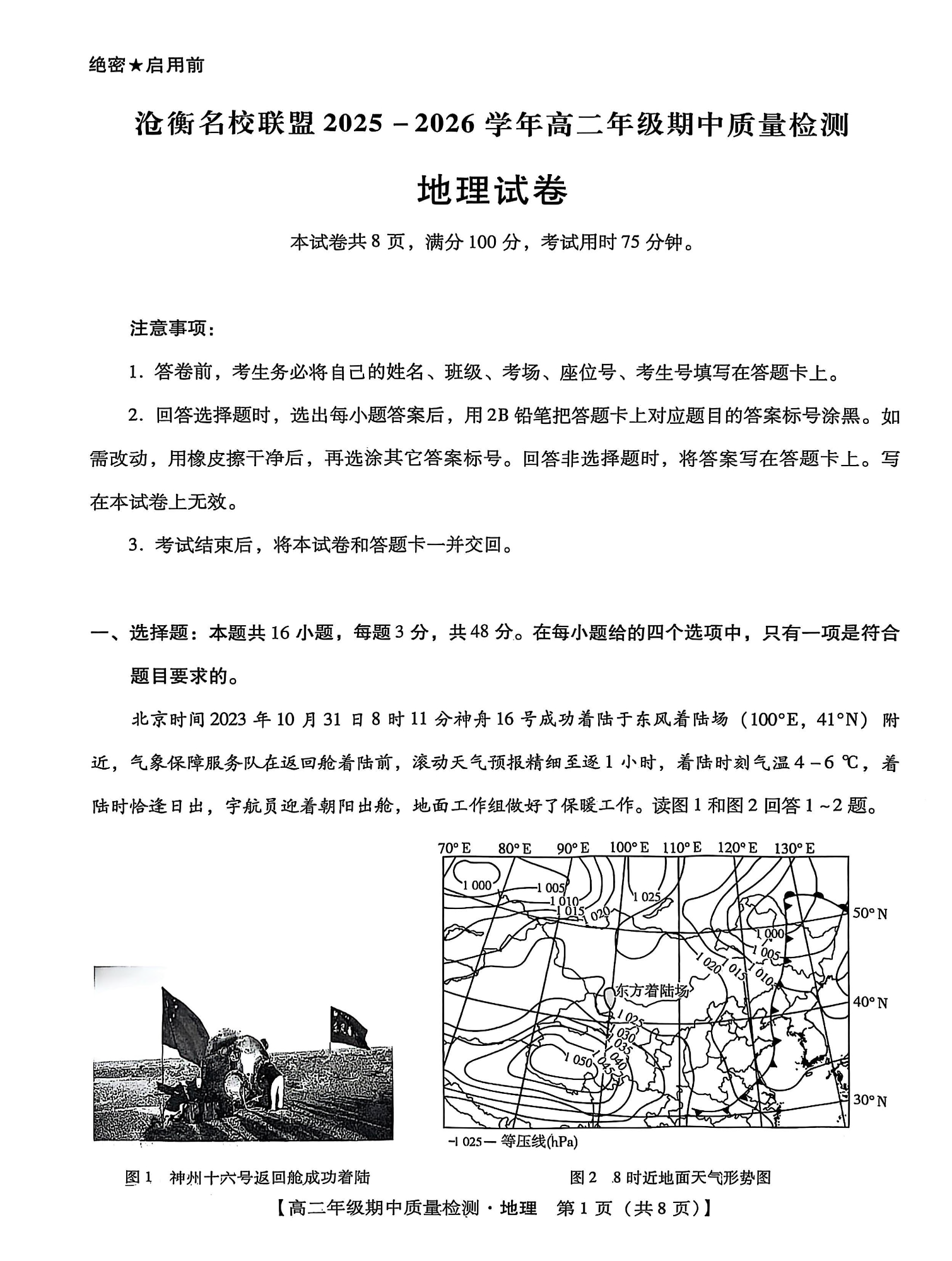 河北省沧衡名校联盟2025-2026学年高二上学期期中考试 地理试题(含答案).pdf