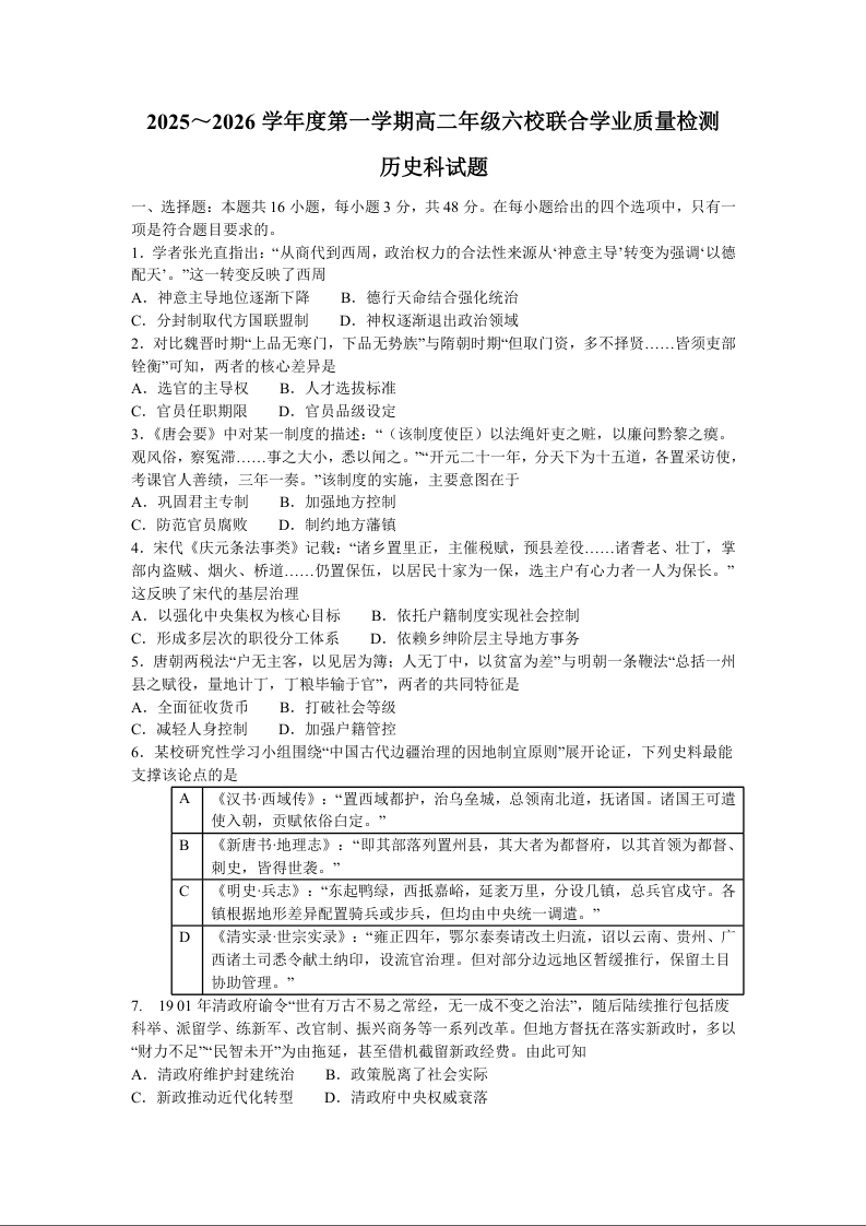 广东省六校2025-2026学年高二上学期12月联合学业质量检测 历史试题(含答案).docx