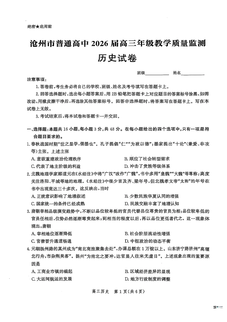 河北省沧州市普通高中2026届高三年级教学质量监测 历史试题(含答案).pdf