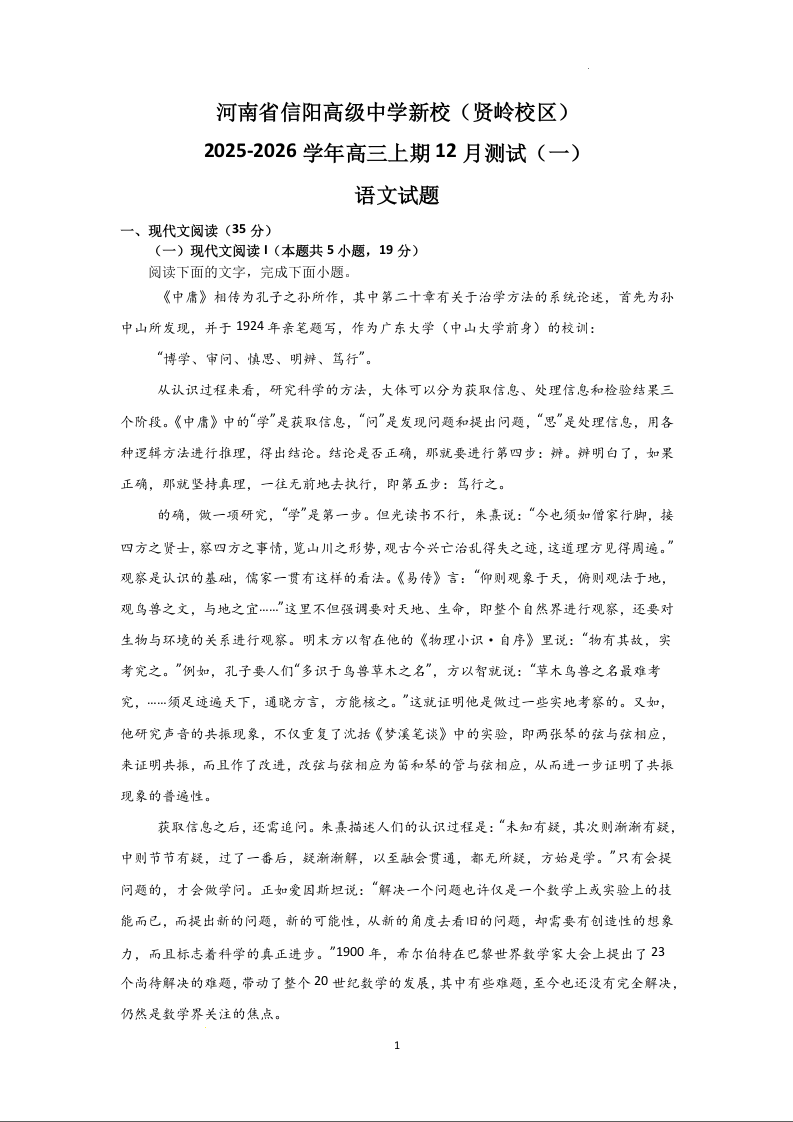 河南省信阳高级中学2025-2026学年高三上期12月测试(一)语文.docx