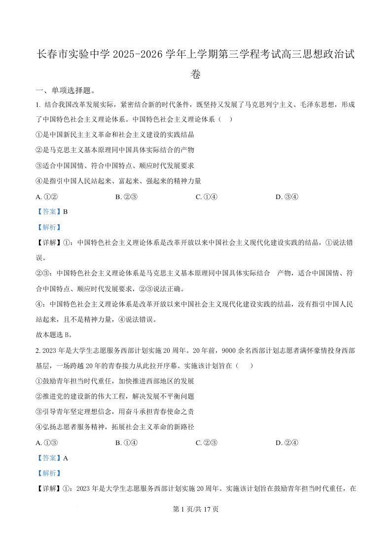 长春市实验中学2025-2026学年高三上学期第三学程考试 政治答案.docx