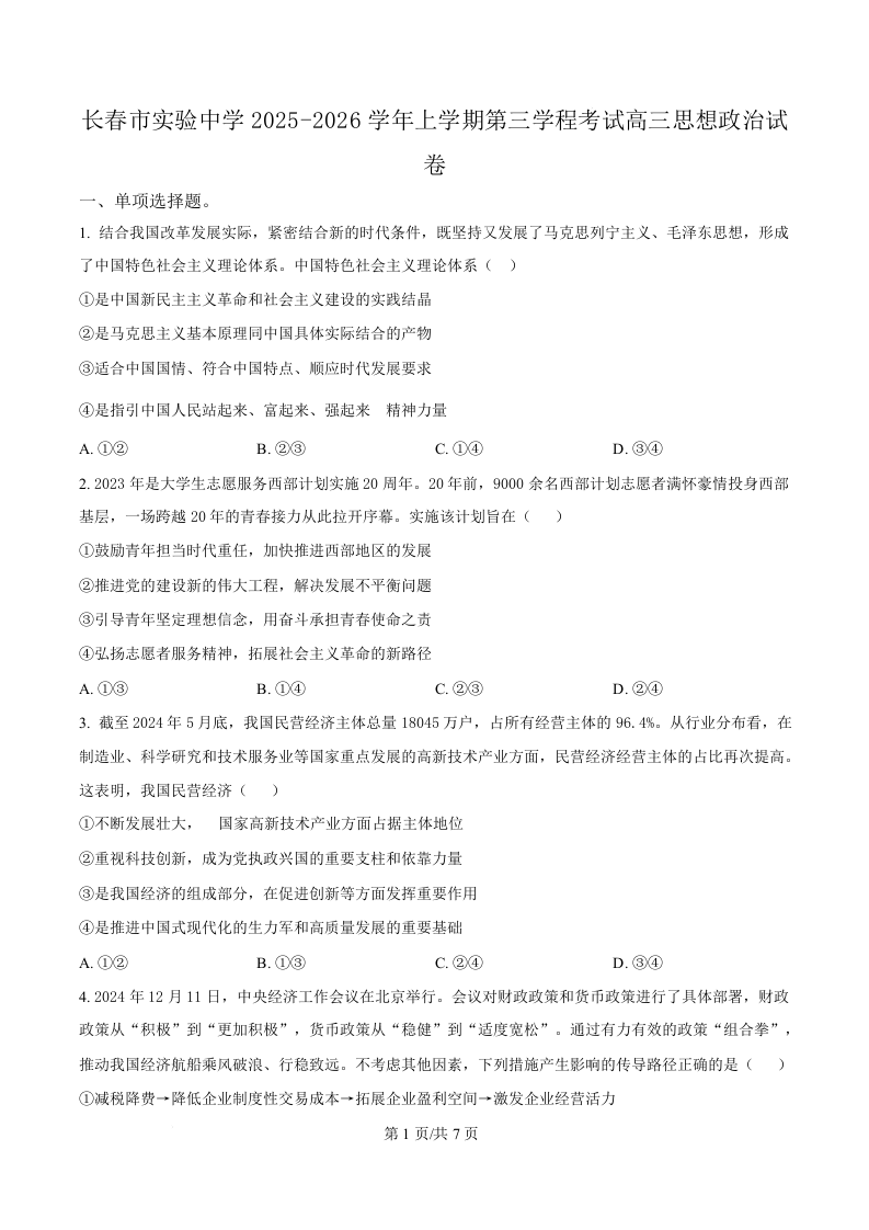 长春市实验中学2025-2026学年高三上学期第三学程考试 政治.docx