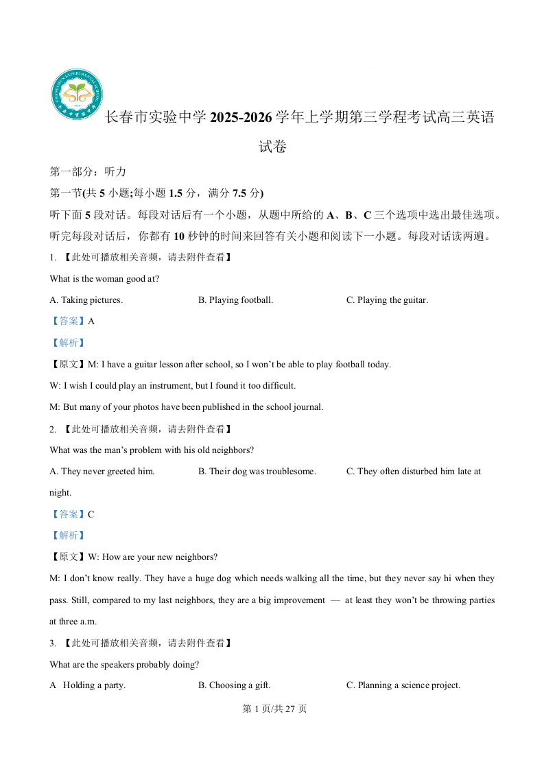 长春市实验中学2025-2026学年高三上学期第三学程考试 英语答案.docx