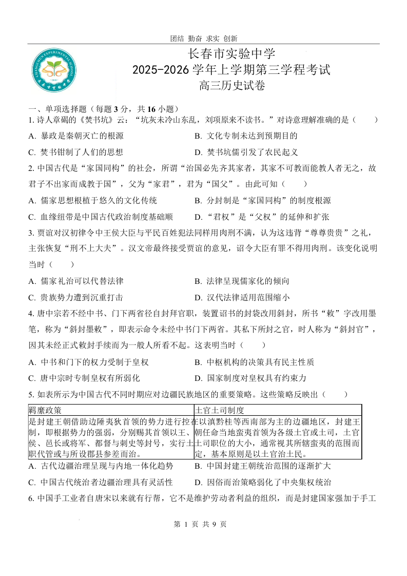 长春市实验中学2025-2026学年高三上学期第三学程考试 历史.docx