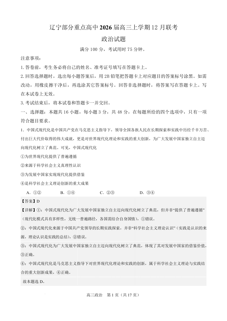辽宁省部分重点高中2026届高三上学期12月联考 政治答案.docx