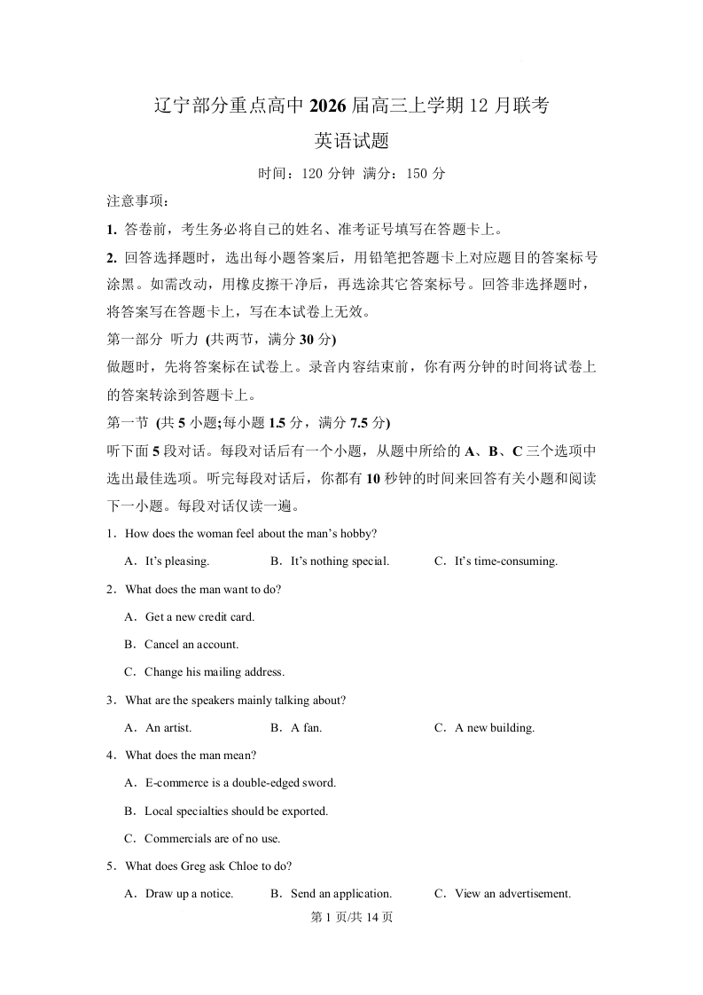 辽宁省部分重点高中2026届高三上学期12月联考 英语.docx