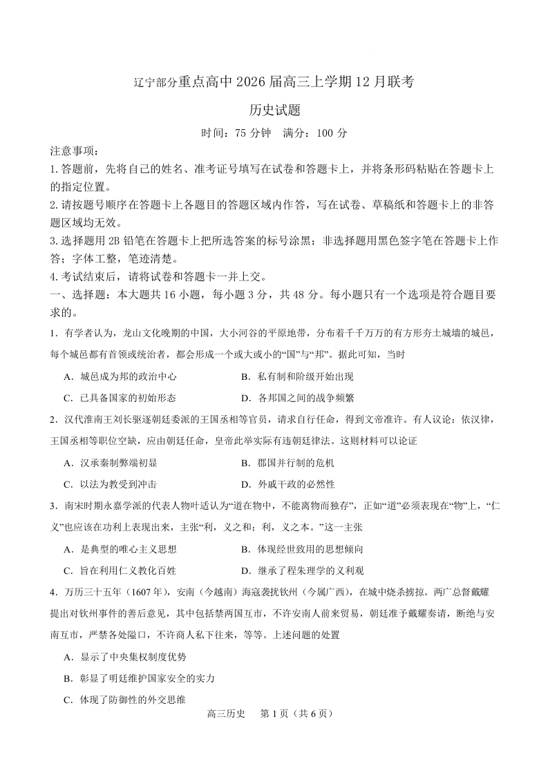 辽宁省部分重点高中2026届高三上学期12月联考 历史.docx