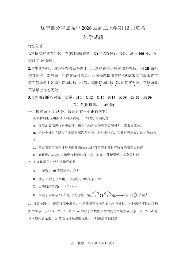 辽宁省部分重点高中2026届高三上学期12月联考 化学.docx