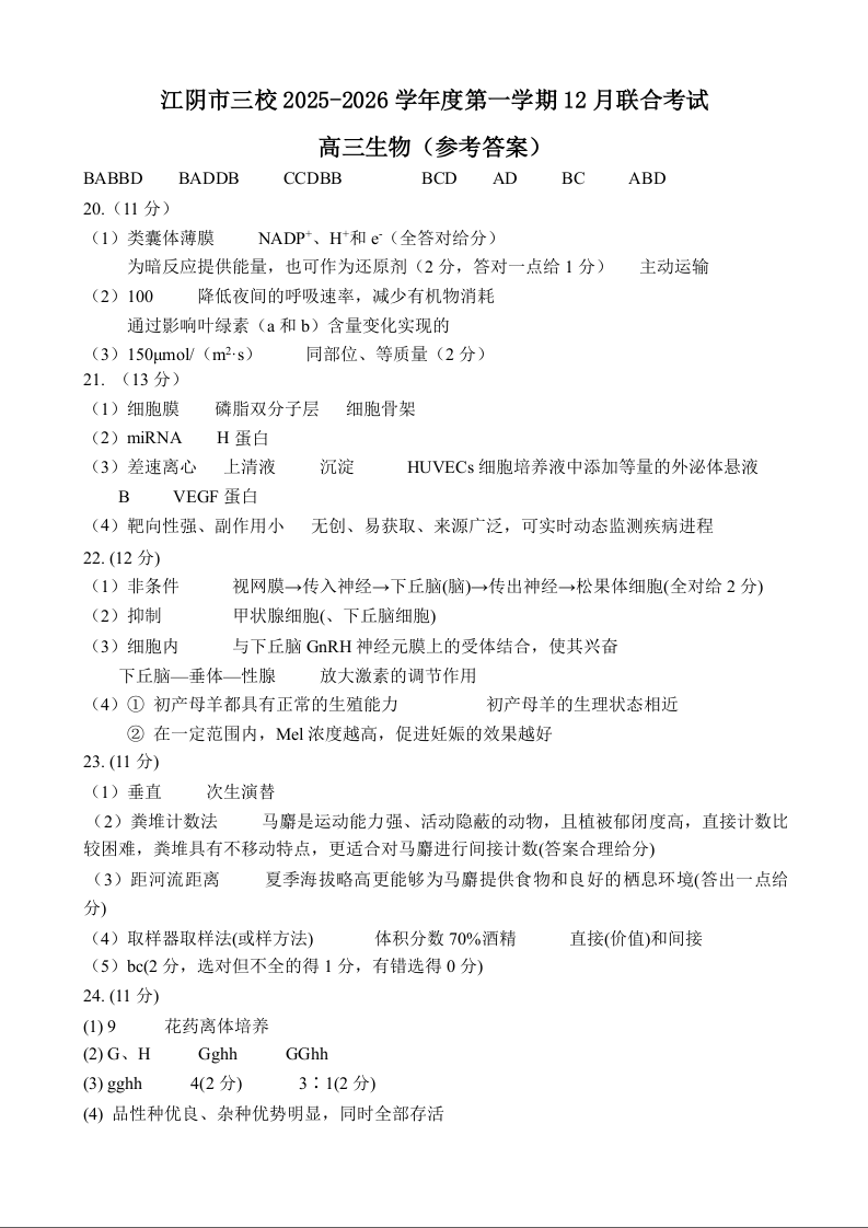 江阴市三校2025-2026学年度第一学期高三12月联合考试 生物答案.docx