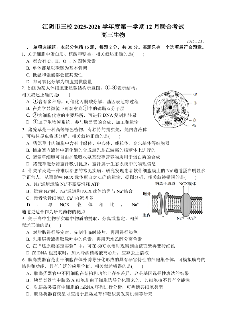 江阴市三校2025-2026学年度第一学期高三12月联合考试 生物.docx