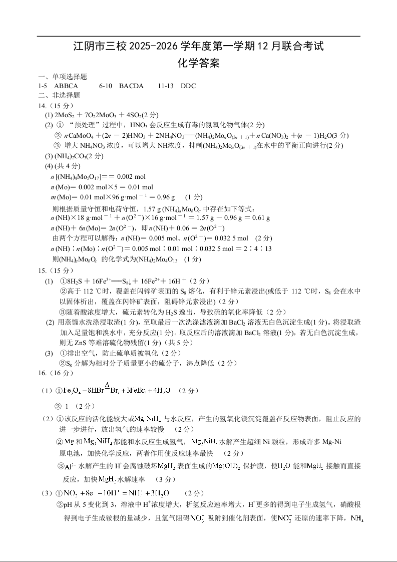 江阴市三校2025-2026学年度第一学期高三12月联合考试 化学答案.docx