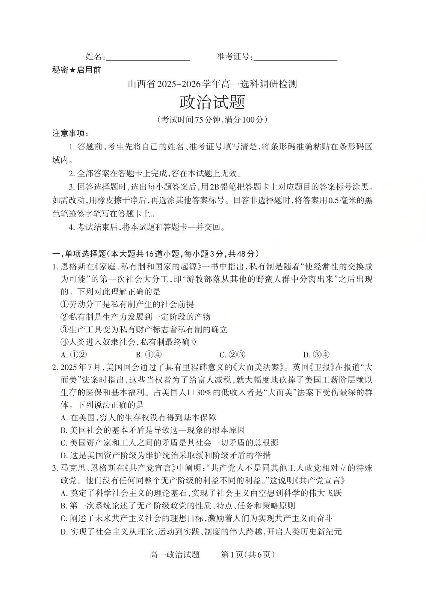 山西省三重教育2025-2026学年高一年级12月选科调研检测 政治.pdf