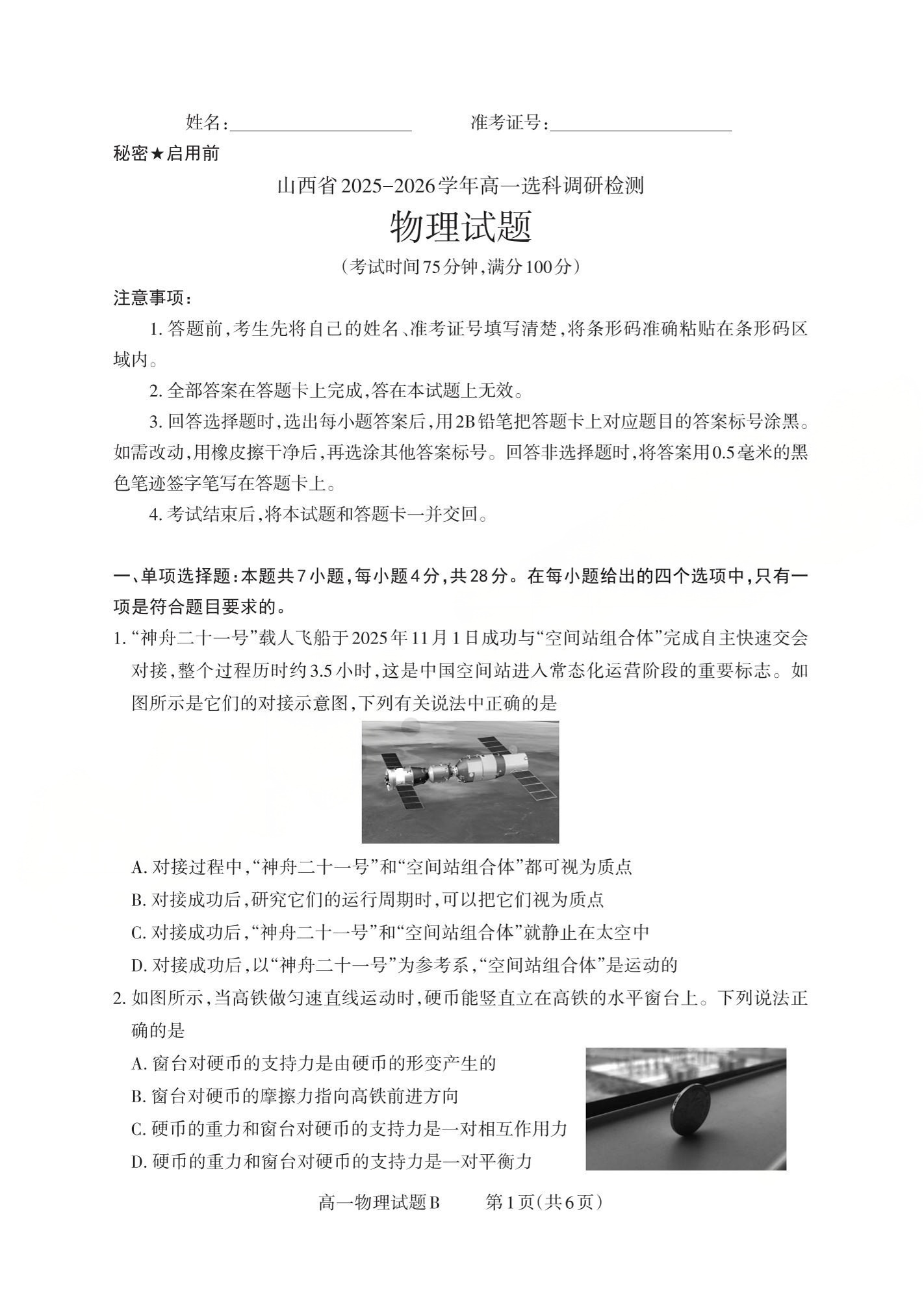山西省三重教育2025-2026学年高一年级12月选科调研检测 物理(B).pdf