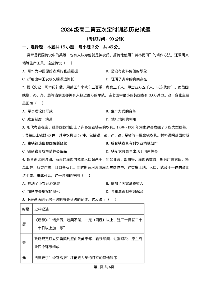 山东省菏泽市鄄城县第一中学2025-2026学年高二上学期12月月考 历史试题(含答案).pdf