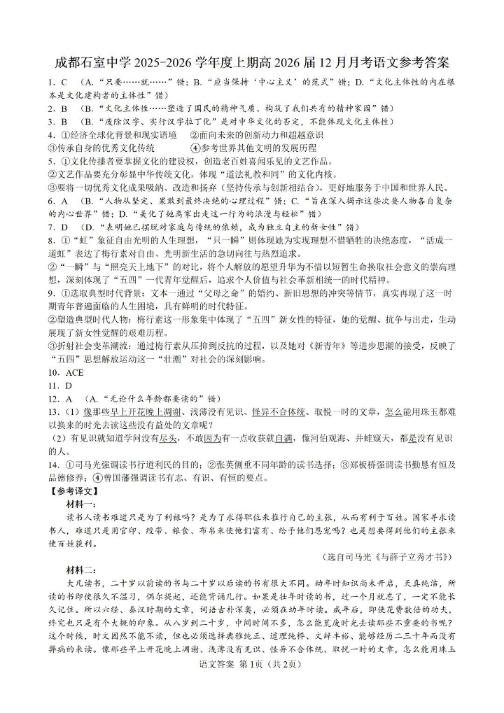 成都石室中学2025-2026学年度上期高2026届一诊模拟考试 语文答案.pdf