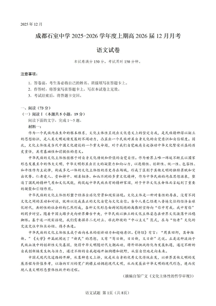 成都石室中学2025-2026学年度上期高2026届一诊模拟考试 语文.pdf