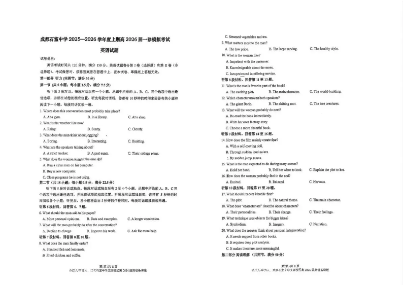 成都石室中学2025-2026学年度上期高2026届一诊模拟考试 英语.pdf