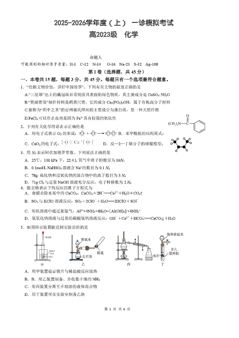 列五中学2025-2026学年度(上)高2023级一诊模拟考试 化学.pdf