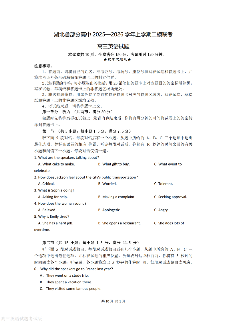 湖北省部分高中2026届高三上学期第二次模拟考试 英语.pdf
