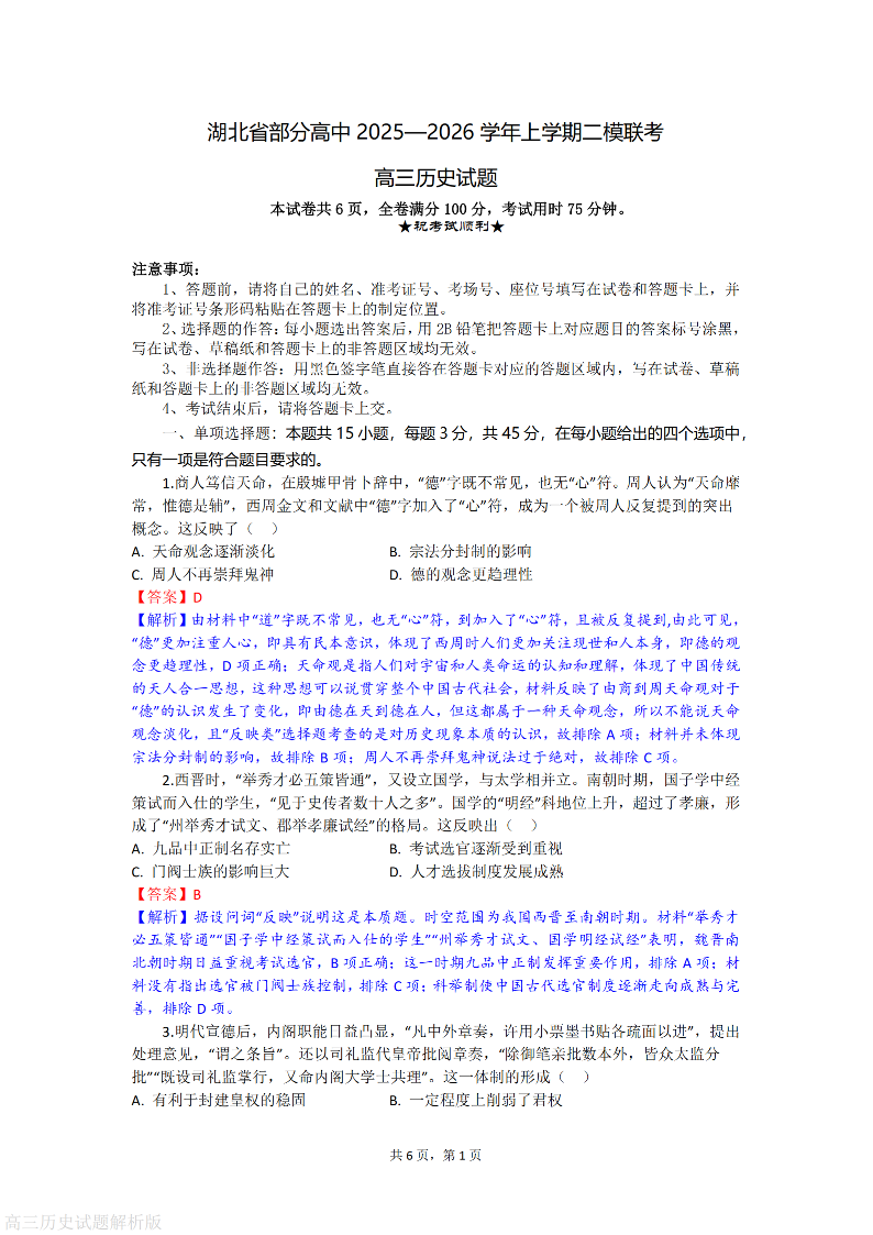 湖北省部分高中2026届高三上学期第二次模拟考试 历史答案.pdf