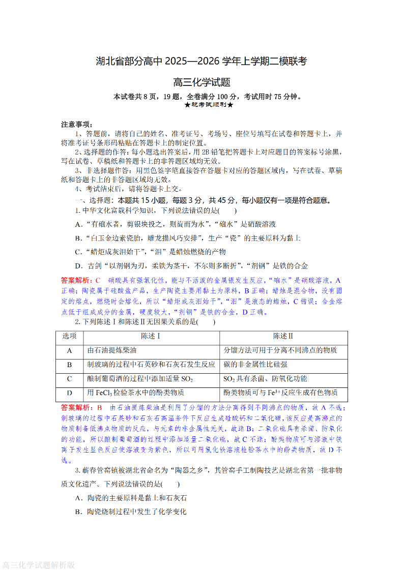 湖北省部分高中2026届高三上学期第二次模拟考试 化学答案.pdf