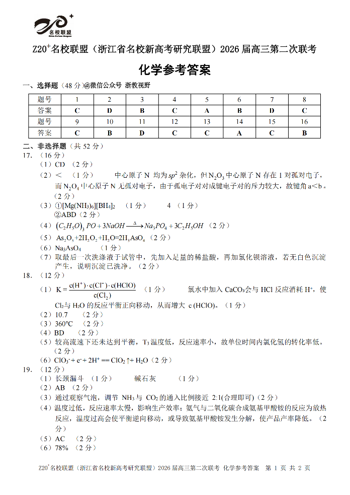 化学答案-Z20名校联盟(浙江省名校新高考研究联盟)2026届高三第二次联考.pdf