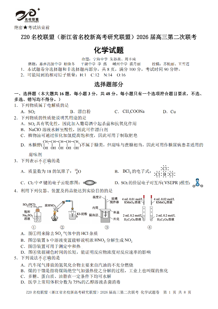 化学试题-Z20名校联盟(浙江省名校新高考研究联盟)2026届高三第二次联考.pdf