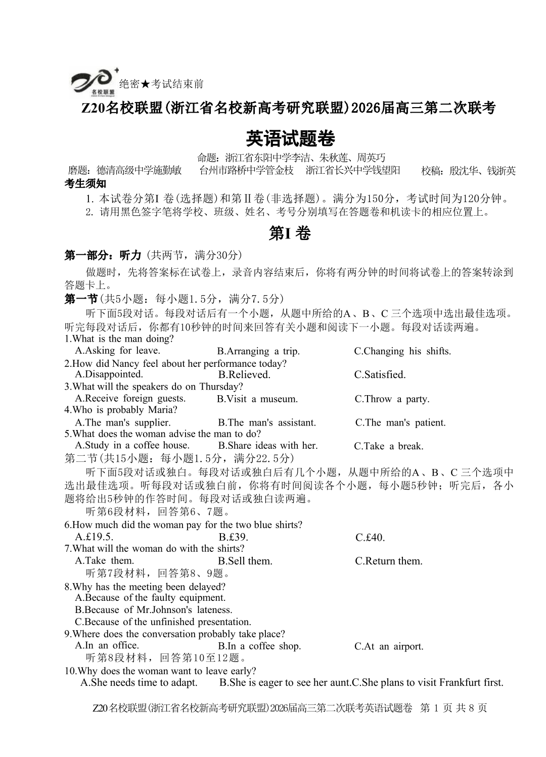 英语试题-Z20名校联盟(浙江省名校新高考研究联盟)2026届高三第二次联考.pdf