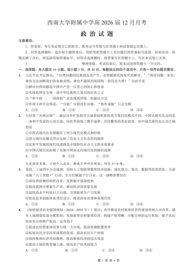 重庆西南大学附属中学高2026届高三12月月考 政治.pdf