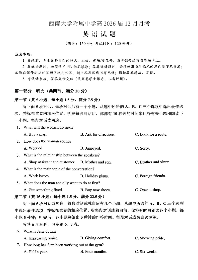 重庆西南大学附属中学高2026届高三12月月考 英语.pdf